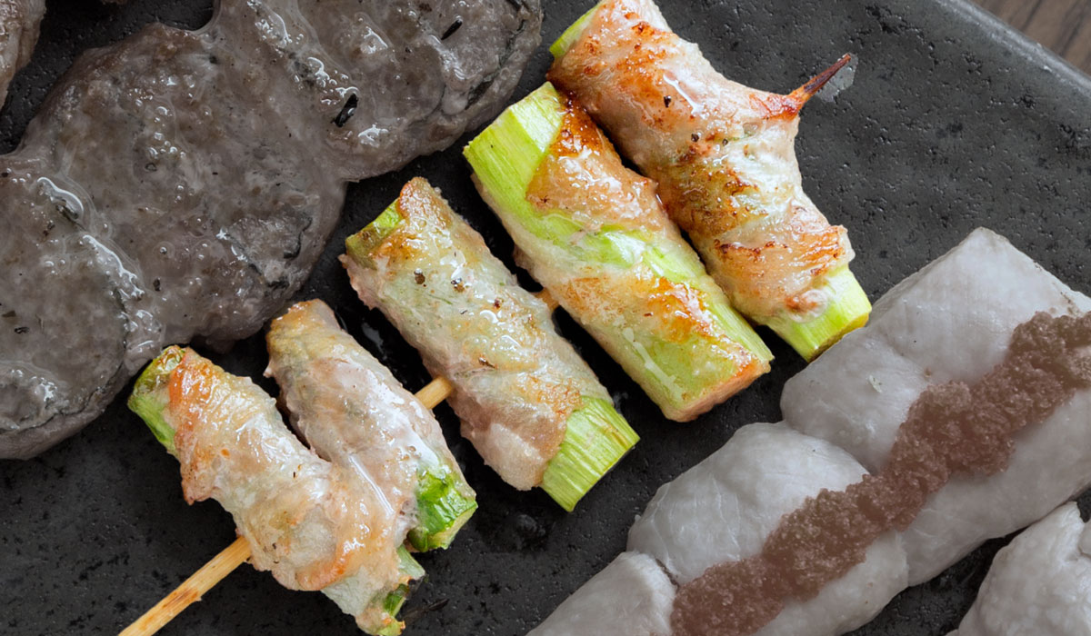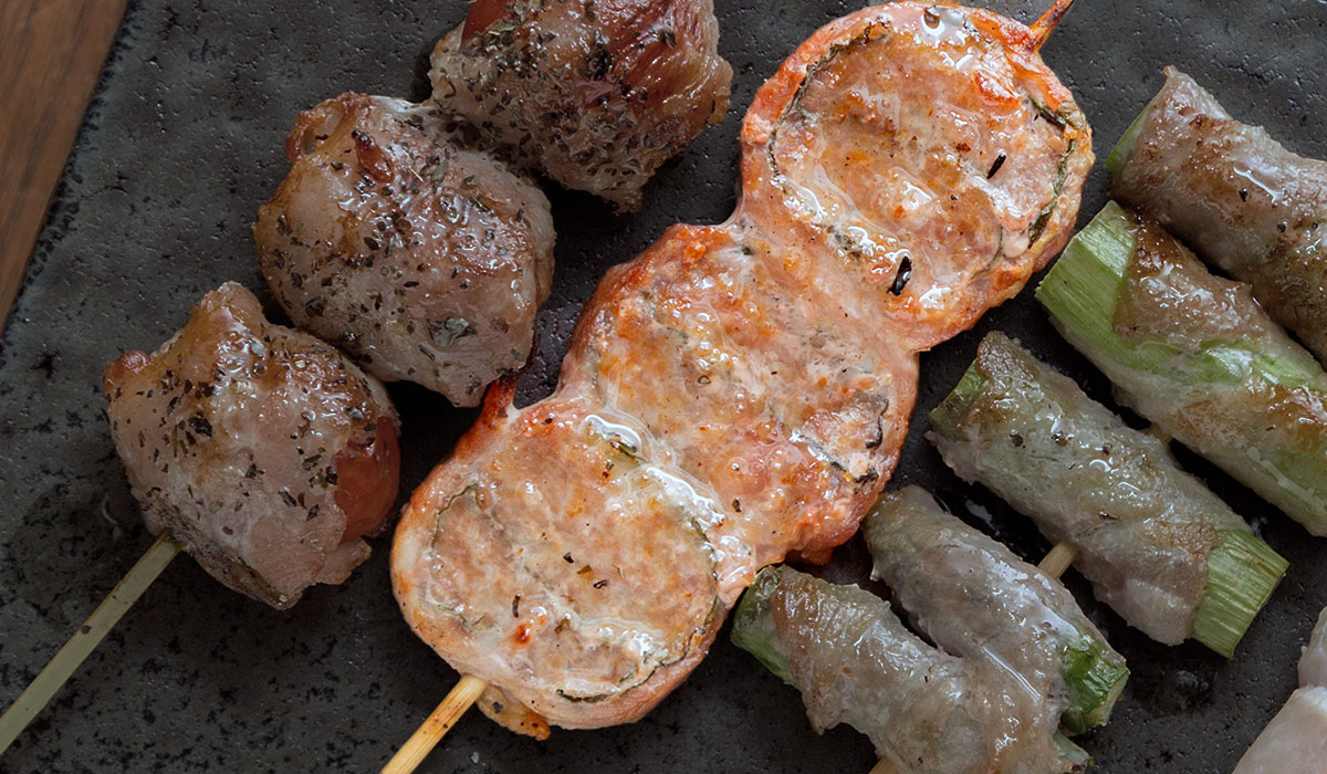 豚バラミンチを紫蘇と豚ロースで巻いた串焼きです。紫蘇のさわやかな香りが肉の美味しさを引き立てます。